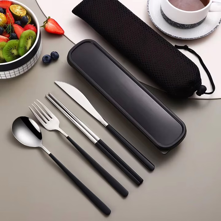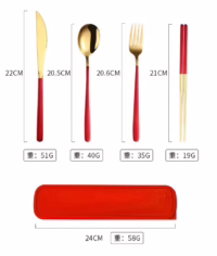 Feature highlights:This Portable Cutlery Set is made from 304 Food Grade Stainless Steel, ensuring durability and safety. The set includes a knife, fork, spoon, and chopsticks, making it perfect for travel, camping, or gifting. Its silver and gold color adds elegance while the plastic box and pouch ensure portability and protection.