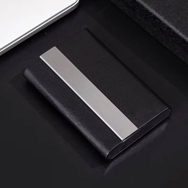 Feature highlights:Slim steel business card holder with magnetic closure, ideal for corporate gifting and branding.\nCrafted from PU leather and metal, offers durable, scratch-resistant performance with laser engraving option.\nCustomize with logo or name.